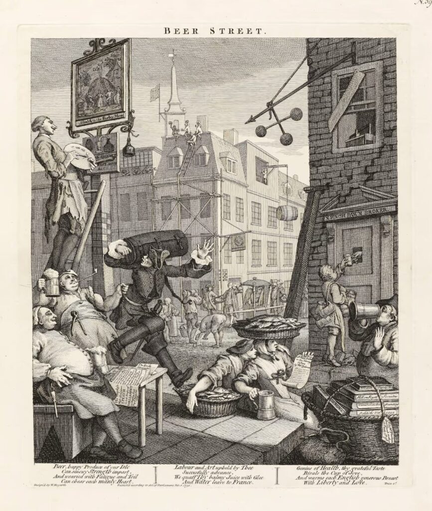 18世紀、フランスとの戦争によりワインの輸入が途絶えたことで、貴族たちは自国でワインに匹敵する酒を求めました。その中で生まれたのが、大麦をふんだんに使い、高いアルコール度数と熟成に耐える力を持ったビールでした。https://www.royalacademy.org.uk/art-artists/work-of-art/beer-street-1?utm_source=chatgpt.com
